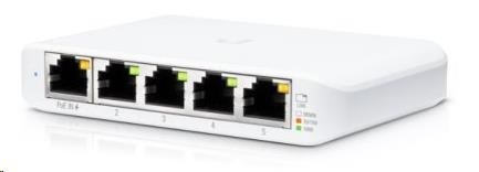 USW-Flex-Mini je malý 5-portový gigabitový prepínač so správou UniFi Controller od spoločnosti Ubiquiti Networks v stolnom vyhotovení s prvým portom podporujúcim PoE In.