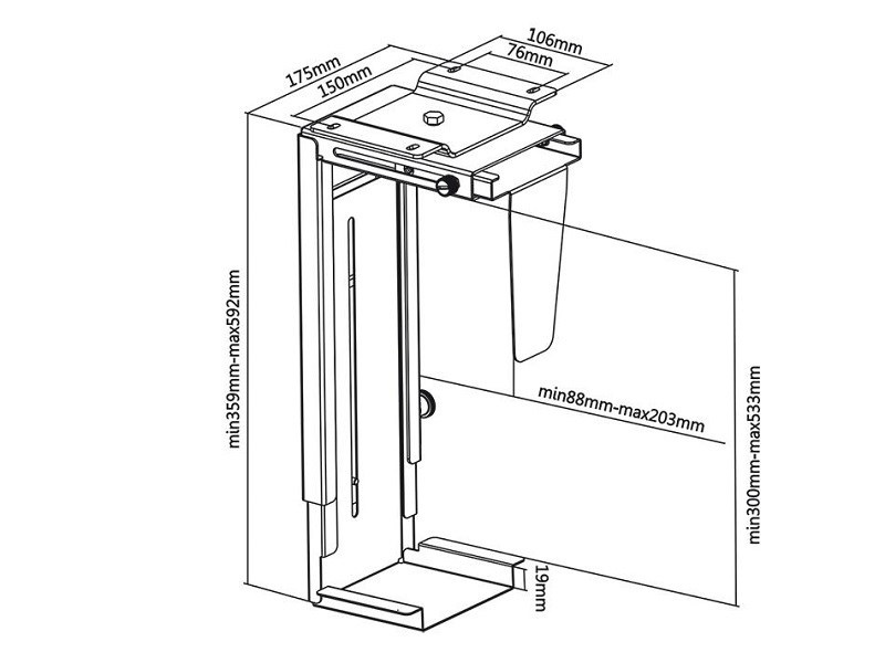 Univerzálny držiak na PC Fiber Mounts M7C13B Profesionálny držiak na PC, uchytenie na stôl alebo stenu, nastavenie na požadované rozmery, nosnosť 10kg Držiak na PC špičkovej kvality a bezpečnosti. Veľmi pevné uchytenie vášho PC na stôl alebo stenu. Nastavenie na rozmery vášho PC. Materiál oceľ, farebné prevedenie čierne. Na PC s hmotnosťou až 10kg. Jednoduchá a rýchla inštalácia. Záruka 5 rokov. Držiak na PC počítač na uchytenie pod stolom, na bočnici stola, na stenu alebo aj na strop Fiber Mounts M7C13B Technické údaje: nosnosť 10kg univerzálny, vhodný na väčšinu dostupných PC šírka PC od 88mm do 203mm výška PC od 359mm do 592mm dĺžka PC nie je podstatná otáčanie do strán zaistenie v požadovaných rozmeroch profesionálny výrobok špičkovej kvality bezpečný, pevný, spoľahlivý uchytenie na zvislú alebo vodorovnú plochu pod stolovou doskou, na bočnici stola, na stenu alebo aj na strop materiál oceľ farebné prevedenie čierne záruka 5 rokov Stolový držiak na uchytenie počítača PC toweru Fiber Mounts M7C13B Univerzálny držiak PC, ktorý uchytíte na akúkoľvek zvislú alebo vodorovnú plochu - pod dosku stola, na bočnicu stola, na stenu alebo napríklad na strop. Univerzálny, nastavenie na požadované rozmery a zaistenie v pozícii. Jednoduchá a rýchla montáž.