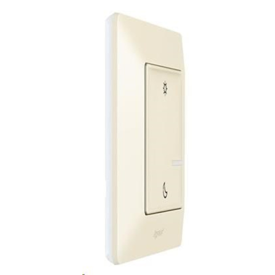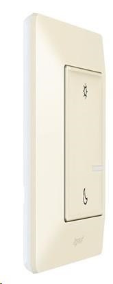 Valena Life s bezdrôtovým ovládačom scenárov Netatmo "spím/budím sa" (batéria CR2032 a obojstranná lepenka sú súčasťou balenia), zadná strana je úplne plochá (možno ju pripevniť na stenu, sklo, nábytok pomocou skrutiek alebo obojstrannej lepenky), scenáre sa nastavujú pomocou aplikácie Home + Control - béžová farba, dodáva sa s béžovým farebným rámom