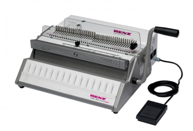Pracovná šírka 360 mm, rozstup ôk 3/1", kapacita dierovania 22 listov 80g papiera, veľkosť diery 4 × 4 mm, max. veľkosť chrbta 16 mm, odnímateľné nože, elektrický pohon dierovania.