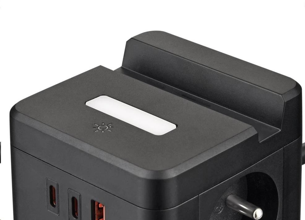 Síťový adaptér VIKING YC23H kombinuje 2 AC výstupy, 3 USB porty, čo umožňuje nabíjanie až 5 zariadení súčasne. Je vybavený držákom na mobilný telefón a dotykovým svetlom so tromi úrovňami svietenia, zabezpečujúcim pohodlné a efektívne používanie doma aj v kancelárii.
