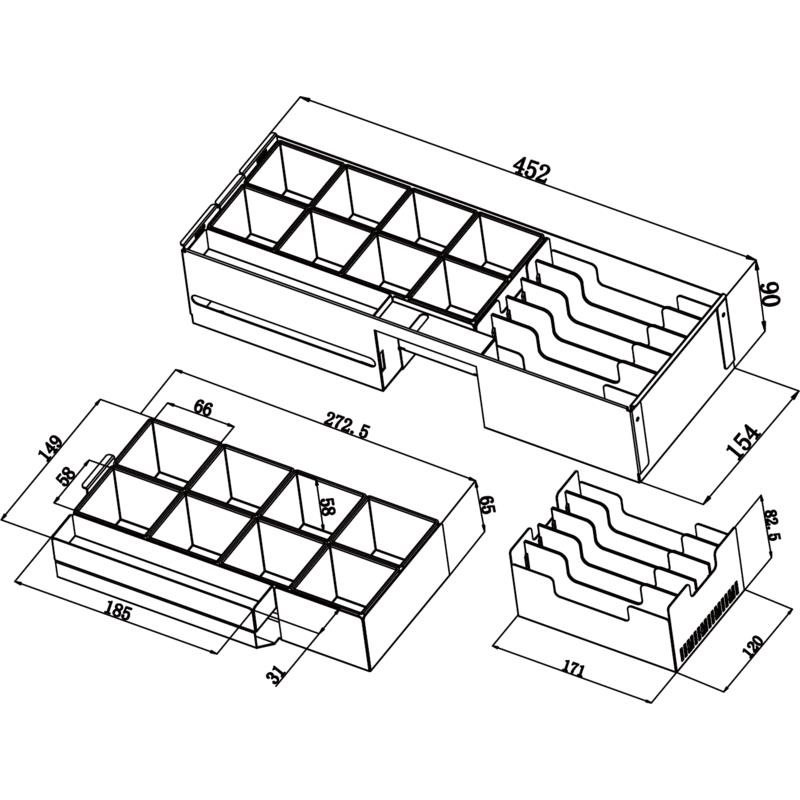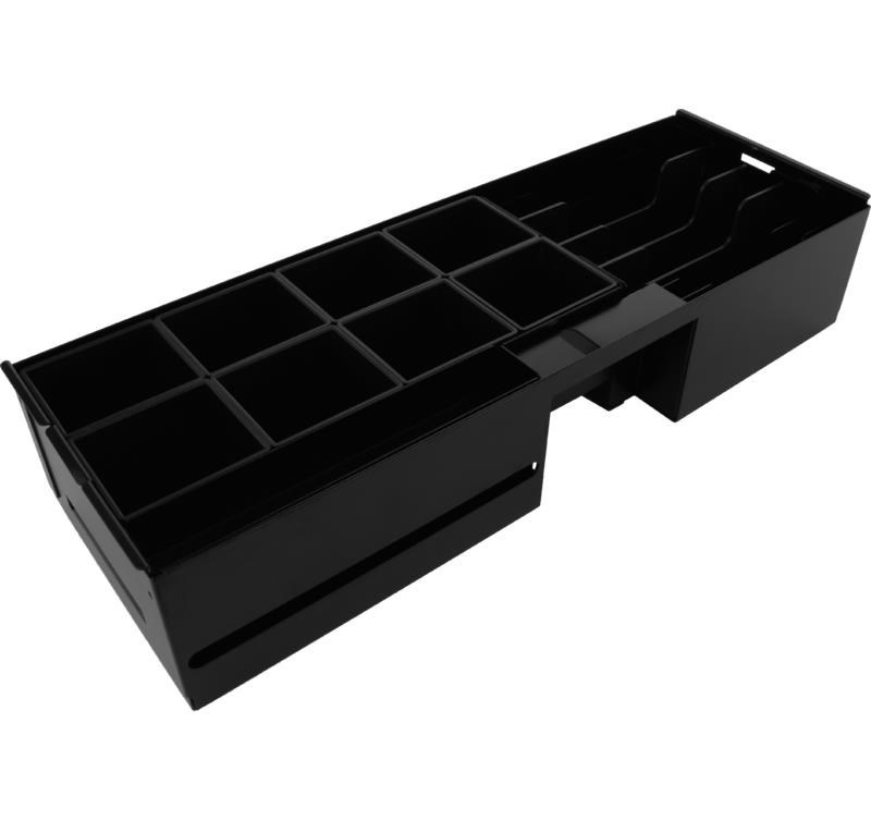 • Vy´jmateľný kovový zásobník na bankovky s plastovými oddelovačmi prihrádok