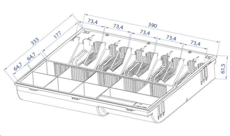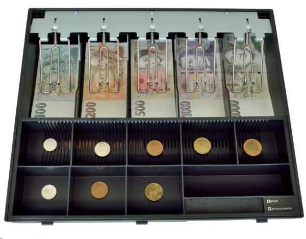 Dostatečně široký pořadač pro pohodlné umístění 5 druhů bankovek vedle sebe. Obsahuje vyjímatelný mincovník a pořadač bankovek s libovolně nastavitelnými přihrádkami. Pořadač disponuje kovovými držáky bankovek a je možné jej doplnit o uzamykatelný kryt