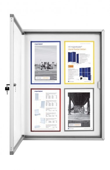 Vitrína Magnetoplan pre vonkajšie priestory. Vnútorná predná stena biela magnetická, s možnosťou označenia - optimálna veľkosť pre formát 6 × A4. Sklenené dvere - bezpečnostné sklo, zámok s dvoma kľúčmi, pozinkovaná kovová zadná stena. Elegantný hliníkový profil po obvode s gumovými tesneniami po obvode dverí. Dodáva sa s montážnym materiálom. Rozmery: vonkajšie (š x v x h): 900 × 790 × 65 mm vnútorná biela plocha (š x v): 790 × 680 mm vnútorná/plná hĺbka: 20/65 mm..