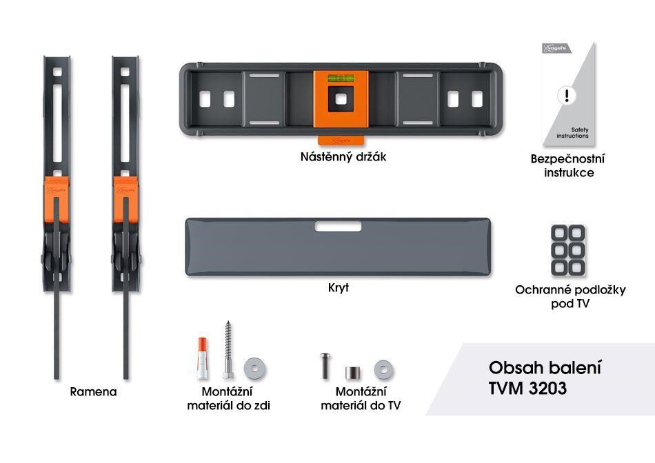 Tento nástenný držiak televízora z radu COMFORT Fixed je ideálnym riešením, ak chcete televízor bezpečne a štýlovo pripevniť na stenu. Nástenný TV držiak je vhodný pre televízory s uhlopriečkou od 19 do 50 palcov a hmotnosťou do 30 kg. Medzi televizorom a stenou je vzdialenosť iba 2,2 cm. Nástenný držiak TVM 3203 je pevný držiak, ktorý nie je možné otáčať ani naklápať. Ideálna voľba, ak sedíte priamo pred televízorom.
