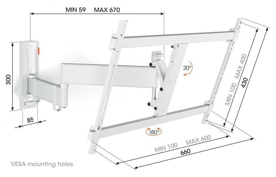 S týmto štýlovým nástenným držiakom série COMFORT Full-Motion+ si môžete sledovanie svojho veľkého televízora maximálne vychutnať. TV 3643 sa môže otáčať až o 180° a nakláňať až o 20° pre optimálne pohodlie pri sledovaní. Je navrhnutý pre intenzívne používanie, takže je ideálny pre rodiny s deťmi. Váš televízor bude zaručene bezpečne a spoľahlivo upevnený. Držiak je vhodný pre televízory s uhlopriečkou 40 až 77 palcov a hmotnosťou do 35 kg.