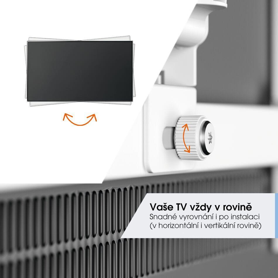 Pre bezpečné naklonenie televízora je nástenný držiak vybavený systémom TiltAnchor™, ktorým môžete zamknúť naklonenie TV. Mäkké podložky na nástennom držiaku chránia zadnú stranu televízora pred poškriabaním počas jeho montáže. TVM 3643 sa ľahko inštaluje. Súčasťou balenia je vrtacia šablóna, skrutky, hmoždinky Fischer® DuoPower, stahovacie pásky na káble a vodováha. Jednoducho si označte prvý vrtací otvor pomocou našej bezplatnej aplikácie DrillRight™ AR. Je váš televízor mierne nakrútený? Žiadny problém. Môžete ho ľahko vyrovnať aj po inštalácii.