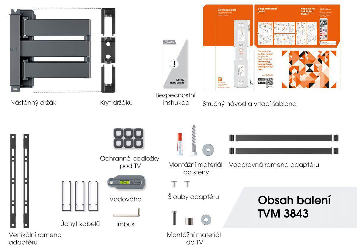 Pre bezpečné naklonenie televízora je nástenný držiak vybavený systémom TiltAnchor™, ktorým môžete zamknúť naklopenie TV. Mäkké podložky na nástenom držiaku chránia zadnú stranu televíza pred poškriabaním počas jeho inštalácie. TVM 3843 sa ľahko inštaluje. Súčasťou balenia je vrtacia šablóna, skrutky, hmoždinky Fischer® DuoPower, pásky na káble a vodováha. Jednoducho si vyznačte prvý vrtací otvor našou bezplatnou aplikáciou DrillRight™ AR. Je váš televízor mierne naklonený? Žiadny problém. Môžete ho ľahko vyrovnať, aj po inštalácii.