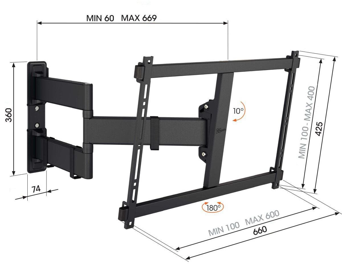 S týmto štýlovým nástenným držiakom rady COMFORT Full-Motion+ si môžete sledovanie svojho veľkého televízora maximálne užívať. TV 3843 sa môže otáčať až o 180° a nakláňať až o 10° pre optimálne pohodlie pri sledovaní. Je navrhnutý pre intenzívne používanie, takže je ideálny pre rodiny s deťmi. Váš televízor bude zaručene bezpečne a spoľahlivo upevnený. Držiak je vhodný pre televízory s uhlopriečkou 50 až 100 palcov a hmotnosťou do 55 kg.
