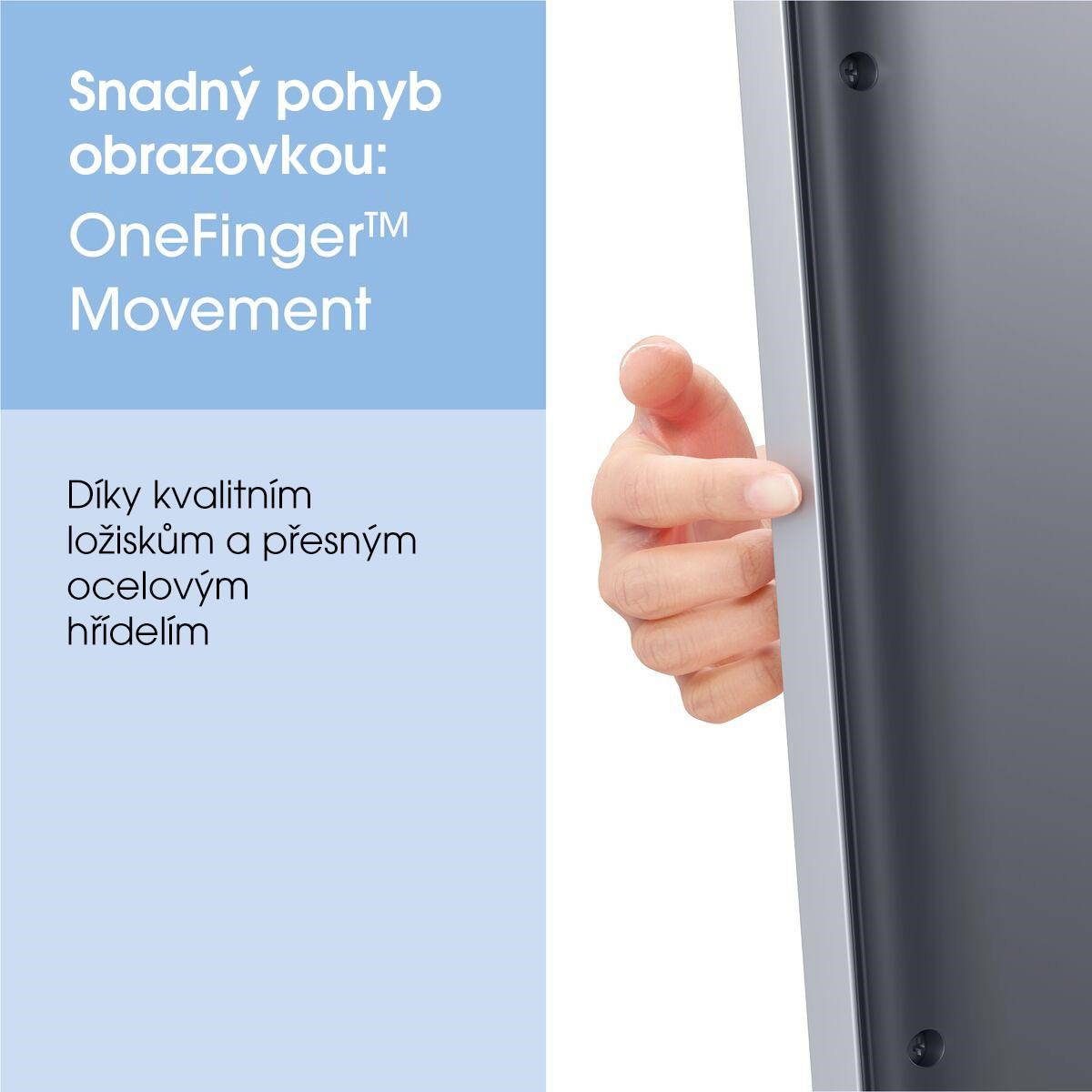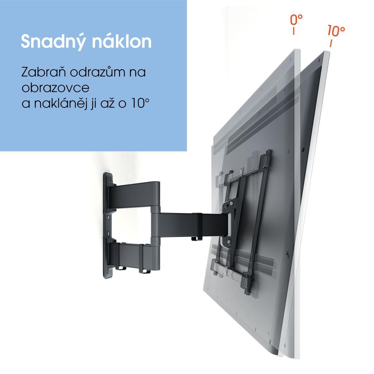 Umiestnenie televízora do požadovaného pozorovacieho uhla je mimoriadne jednoduché. TVM 3843 je vybavený jedinečnou technológiou One-Finger™ Movement spoločnosti Vogel's. Pohyb s držiakom je potom veľmi ľahký a plynulý. Vďaka extrémne dlhým ramenám môžete televízor natočiť do veľkého uhla. Maximálny uhol natočenia závisí od šírky konkrétneho televízora.