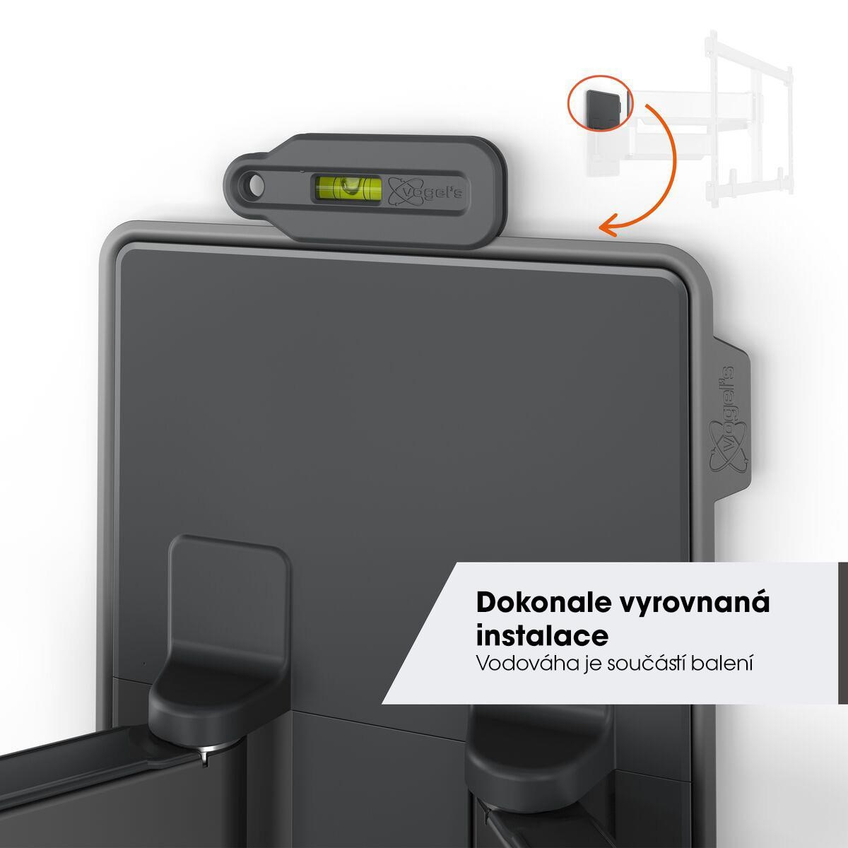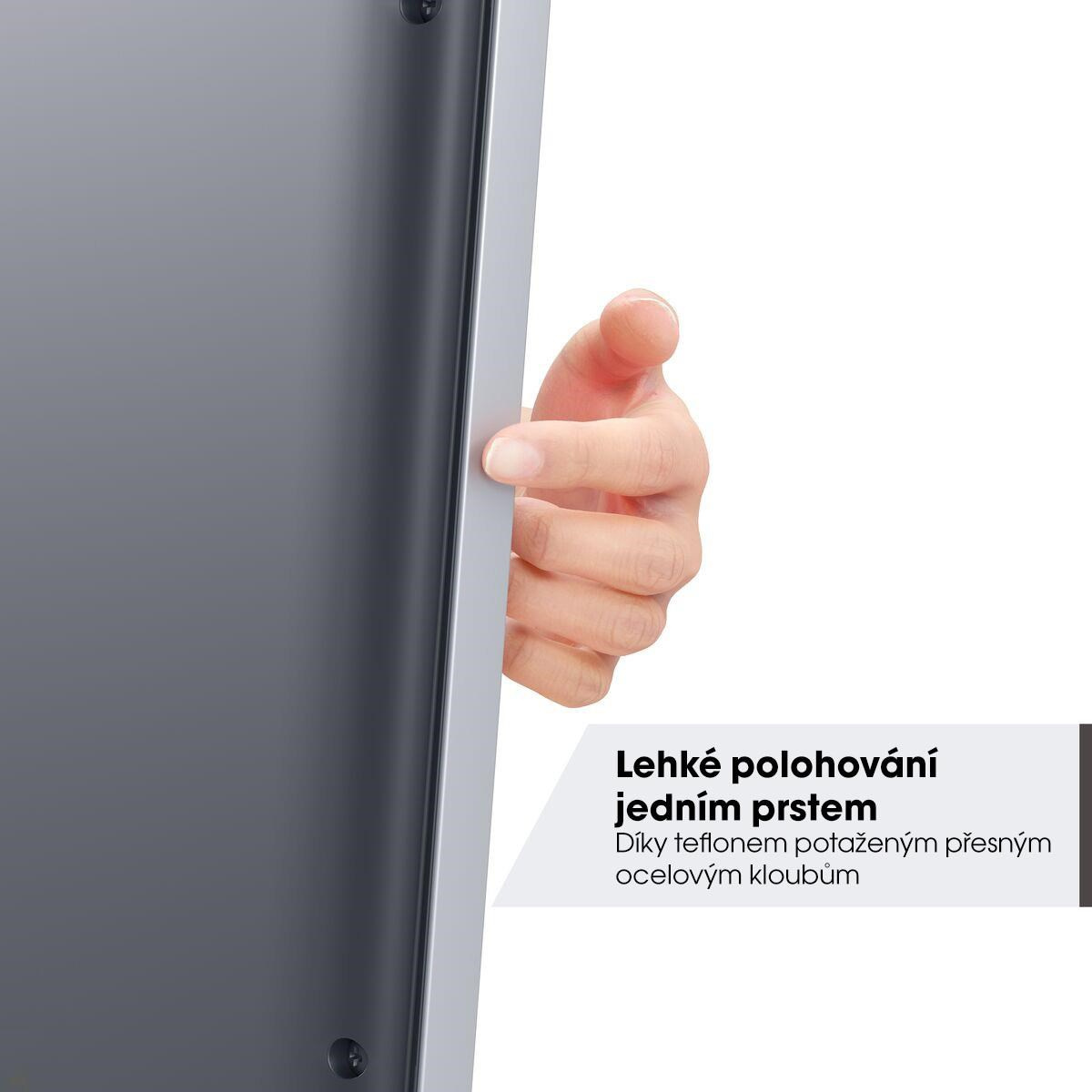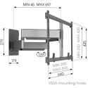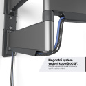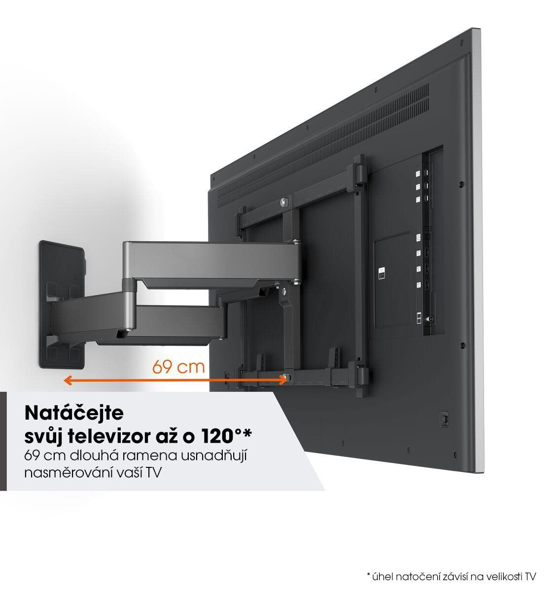 Vďaka 69 cm dlhým ramenám má držiak veľký dosah dopredu, takže je ideálny na montáž do skrine alebo niky. Funkcia naklápania bola zámerne vynechaná kvôli ochrane veľkých citlivých obrazoviek. Výhodou veľkých obrazoviek je samozrejme to, že pre skvelý zážitok zo sledovania nie je nutné nakláňať.