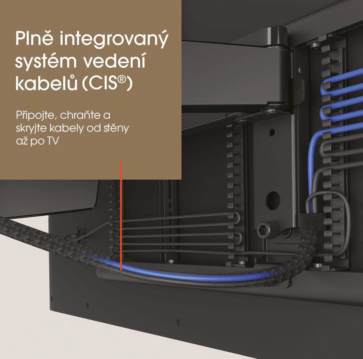 Systém vkladania káblov (CIS®) v nosných ramenách spája, chráni a skrýva káble medzi stenou a televízorom. Okrem toho je TVM 7675 vybavený integrovanými držiakmi káblov. Tieto umožňujú uložiť takmer 4 metre káblov za televízor a udržať ich upratané mimo dohľad za krycou doskou. Máte tiež možnosť skryť káble vo stene tým, že ich pretiahnete šterbinou v nástennej doske držiaku. Súčasťou balenia je HDMI kábel dĺžky 2 metre, ktorý umožňuje automatickú funkciu držiaka MotionMount pri zapínaní a vypínaní televízora. Okrem toho dodávame v balení infračervené diaľkové ovládanie s prijímačom a môžete si stiahnuť bezplatnú aplikáciu MotionMount, ktorá vám umožní ovládať držiak prostredníctvom mobilného zariadenia Apple alebo Android cez Bluetooth.