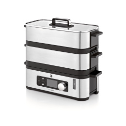 Parný hrniec WMF KITCHENminis® vyrobený z nerezovej ocele Cromargan® s kvalitným sklom víkom plní, čo sľúbil. Má kompaktný dizajn, je vhodný na zdravé varenie, neobsahuje bisfenol A a nie je viazaný na varič. Ide o najmenší systém na varenie z nerezovej ocele Cromargan® s rozmermi len 14,4 x 28,4 cm s výkonom 900 wattov, ktorý umožňuje pripravovať súčasne mäso, ryby, zeleninu a prílohy na dvoch plochách. Dokonalé varenie: vďaka technológii WMF Easy Steaming so dvomi samostatnými plochami na prípravu pokrmov, ktoré je možné samostatne nastaviť, môžete variť všetko naraz. Samotný proces varenia však začína neskôr podľa toho, ako ho nastavíte.