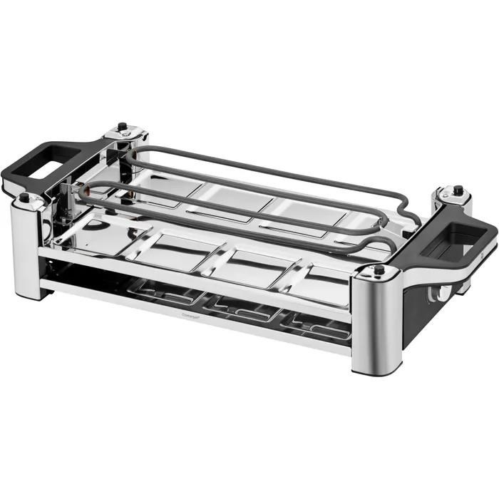Raclette gril Lono od spoločnosti WMF je vybavený otočnou hliníkovou doskou s neprilnavým povrchom, ktorá je ideálna na jemné grilovanie aj na prípravu jemných palaciniek. Jeho nastaviteľná teplota sa prispôsobí každej chuti - od vydatných pokrmov zo taveného syra až po sladké pochúťky, ako je grilované ovocie.