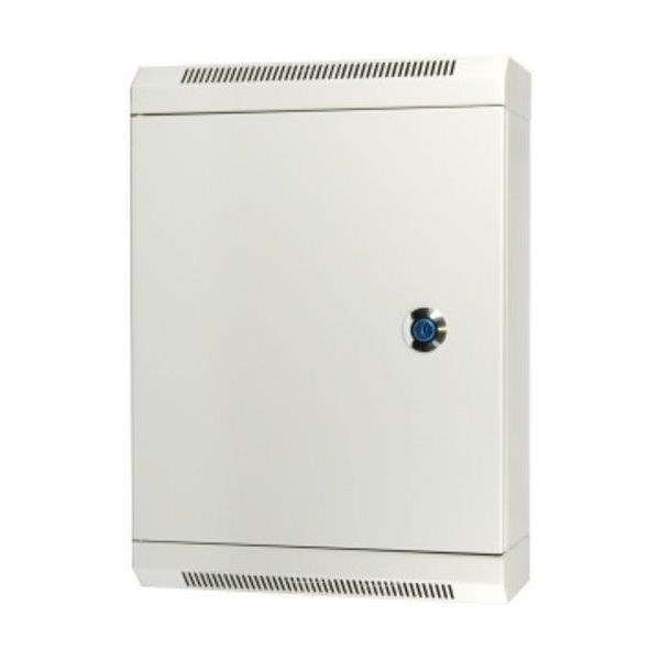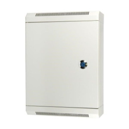 Kovová rozvodná skriňa pre vnútorné inštalácie s DIN lištou. Skrinka je vybavená kovovým zámkom a vetracími otvormi.