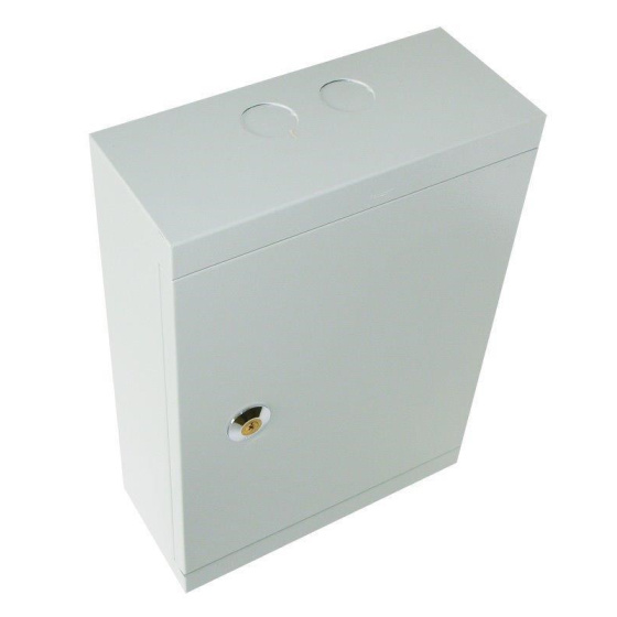 Kovová rozvodná skriňa pre vnútorné inštalácie s DIN lištou. Skrinka je vybavená kovovým zámkom a vetracími otvormi.
