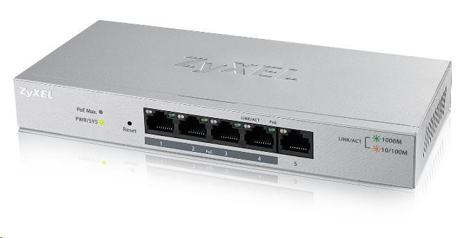 Zyxel GS1200-5HPv2 5-portový stolový gigabitový webový inteligentný PoE switch, 4x PoE+ GbE, PoE 60W, bez ventilátora