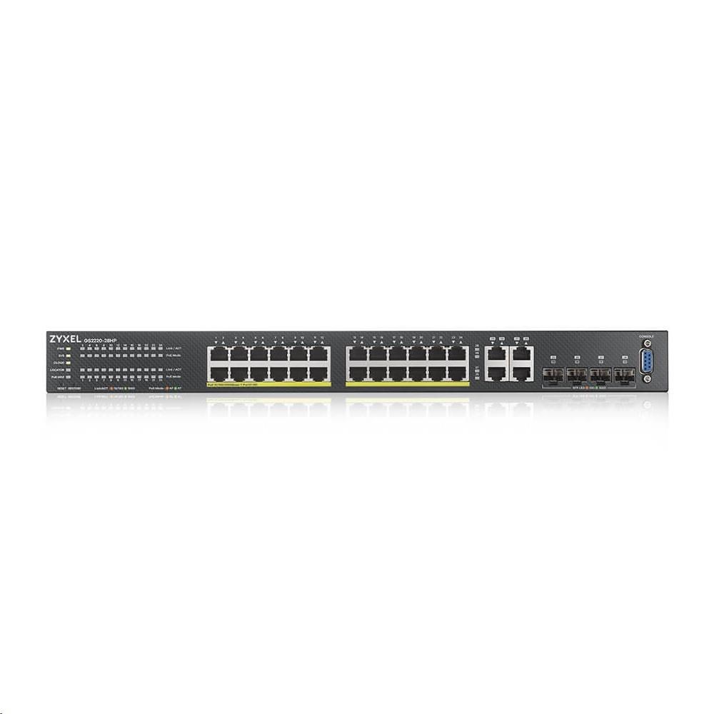 Popis Zyxel GS2220-28HP 28-portový gigabitový PoE manažovaný L2 switch, 24x gigabitový RJ45, 4x gigabitový RJ45/SFP, PoE 375 W
