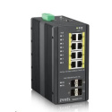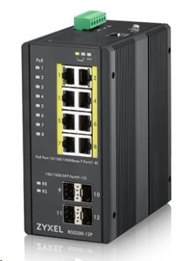 Zyxel RGS200-12P 12-portový gigabitový WebManaged PoE switch, 8x GbE + 4x SFP, rozpočet PoE 240W, montáž na DIN lištu/na stenu, IP30
